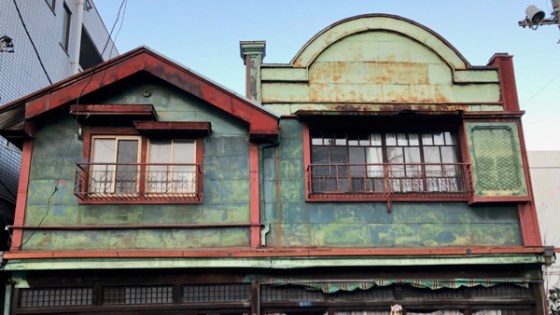 マンサードと切り妻の屋根・外壁が特徴的な看板建築。