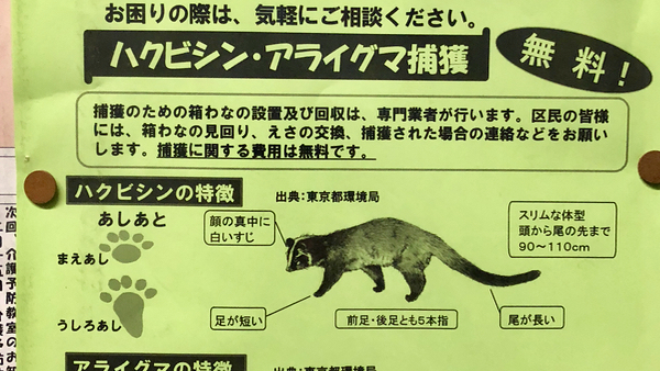 山王商店がの掲示板に、「ハクビシン、アライグマ捕獲無料のお知らせ」が出ていました。大田区でもハクビシンによる被害が出ているのですね。