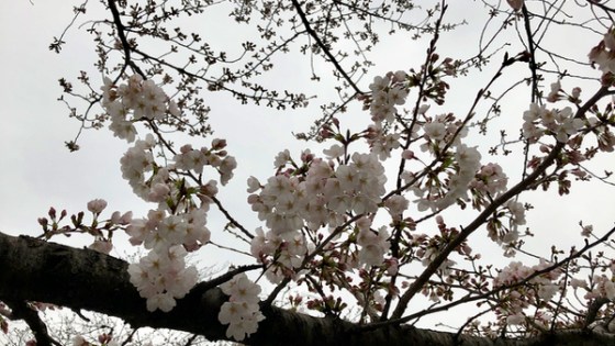 名残雪の舞う春分の日 弁天池公園の桜、三分咲です。