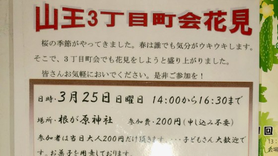 山王3丁目町会の掲示板に「山王3丁目町会花見」のお知らせが出ていました
