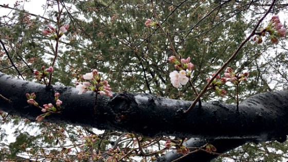 鹿島庚塚公園の桜、一分咲です。冷たい雨が続き開花が進みません。