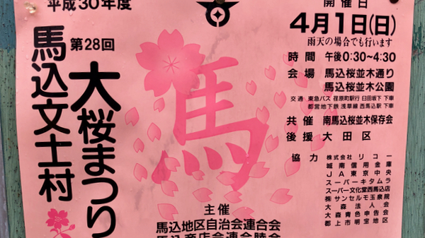 町内の掲示板に「馬込文士村 大桜まつり」のお知らせが出ていました。