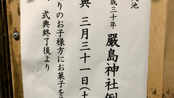 町会の掲示板に、弁天池公園の嚴島神社例大祭のお知らせが出ていました。。 平成30年3月31日