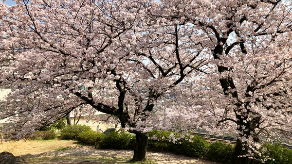 線路越しに見える水神公園の桜も満開です。