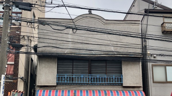 モルタル塗りのマンサード外壁が特徴的な看板建築。足元はタイル貼りでRになっています。洋風でも屋根の上には?