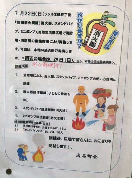 町会の掲示板に、今年の「出石町会 初期消火器訓練」のお知らせが出ていました。