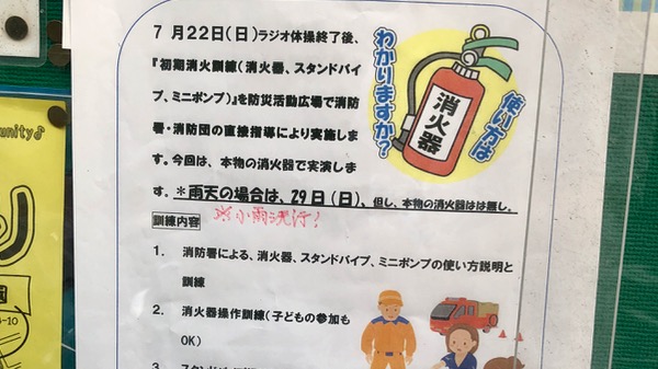 町会の掲示板に、今年の「出石町会 初期消火器訓練」のお知らせが出ていました。