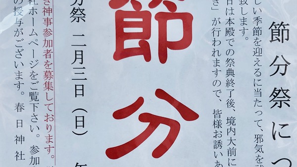 豆まき参加者募集中です。詳細は社務所か春日神社のホームページを確認してください。