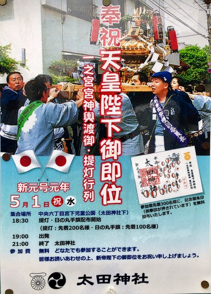 町会の掲示板に「太田神社 奉祝天皇陛下御即位 一之宮宮神輿渡御・提灯行列」のお知らせが出ていました。