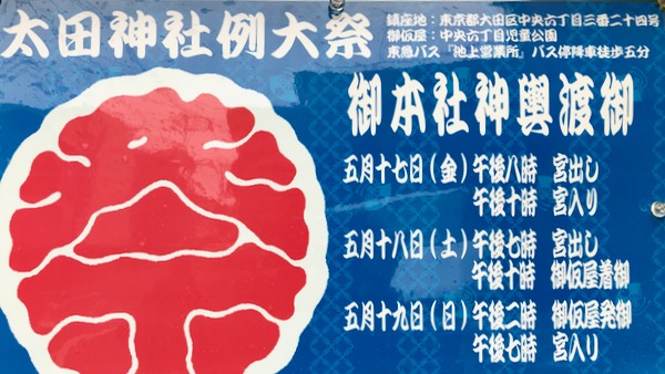 【大田区・太田神社】町会の掲示板に太田神社例大祭のお知らせが出ていました。 令和元年5月17日(金)、18日(土)、19日(日)