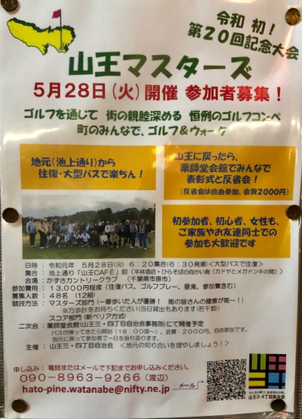 大森の山王商店街掲示板に山王マスターズのお知らせが出ていました。令和元年5月28日の地元向けのイベントです。ゴルフコンペの後には地元さん山王で表彰式と反省会があります。