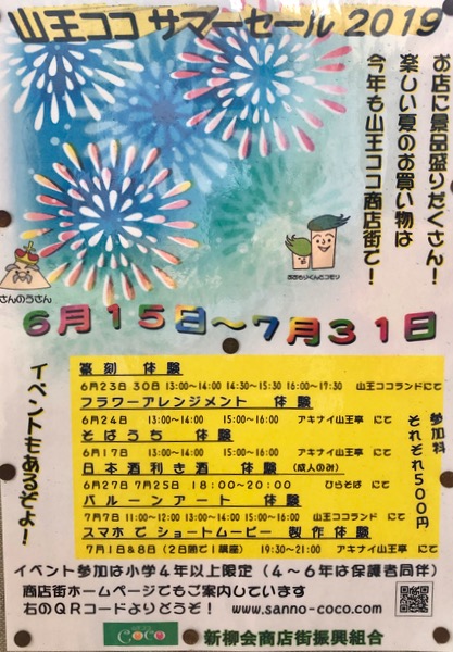 町会の掲示板に、山王COCO商店街・サマーセール2019のお知らせがでていました。もう始まっています。6月15日から7月31日までです。令和元年