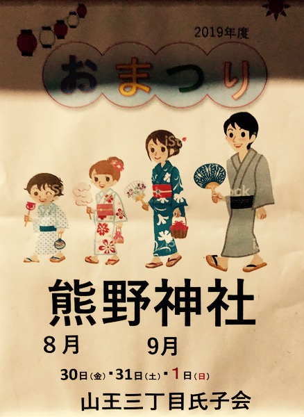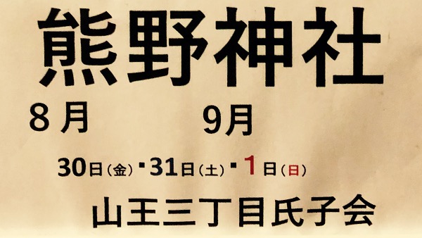 商店街の掲示板に、大森山王の熊野神社例大祭のお知らせが出ていました。