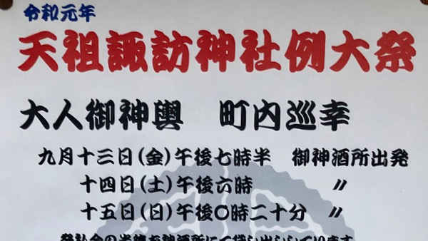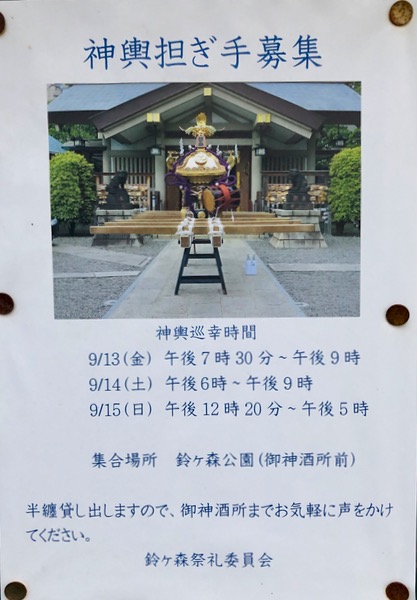 鈴ヶ森町会の掲示板に、大井の天祖・諏訪神社例大祭のお知らせが出ていました。鈴ヶ森祭礼委員会のお知らせです。
