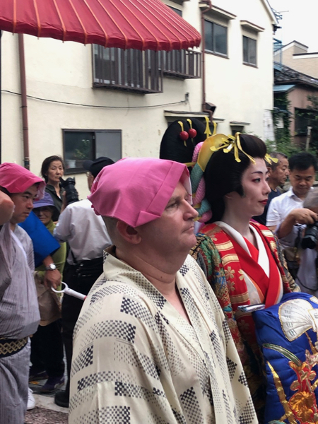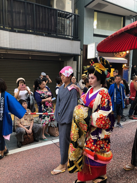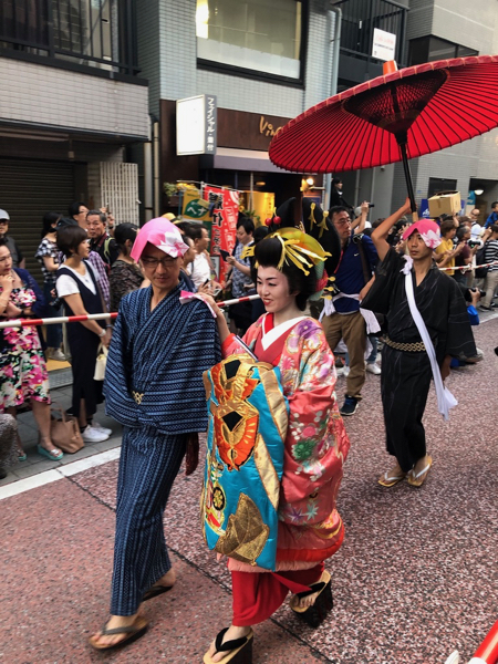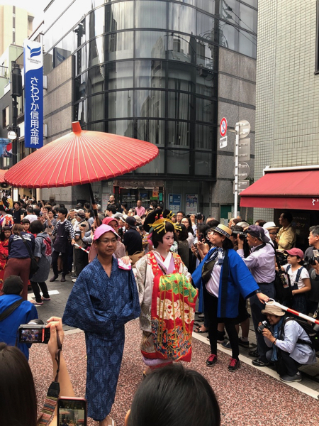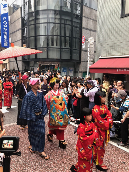 下の写真は2年前の、しながわ宿場まつり・花魁道中の風景です。写真を見返していたら、先頭のおじさんは今年と同じ人が!!
