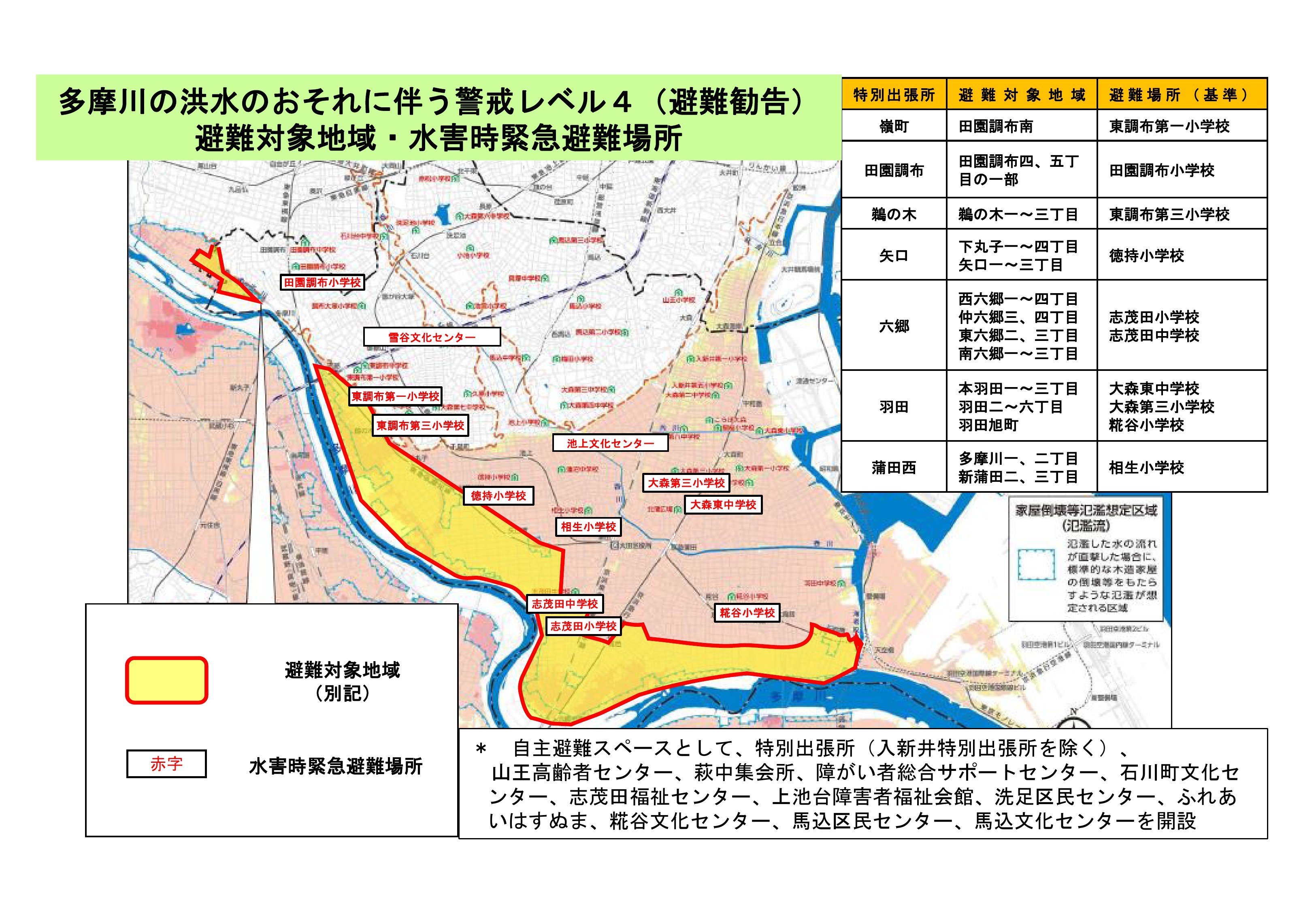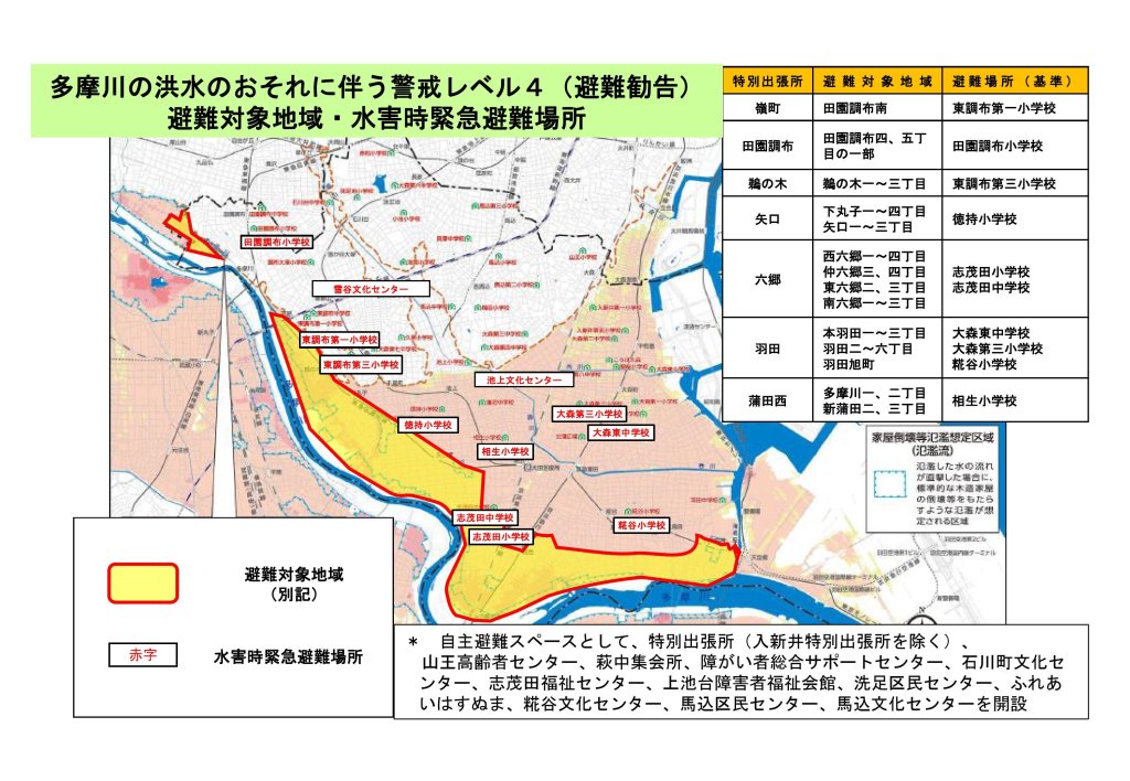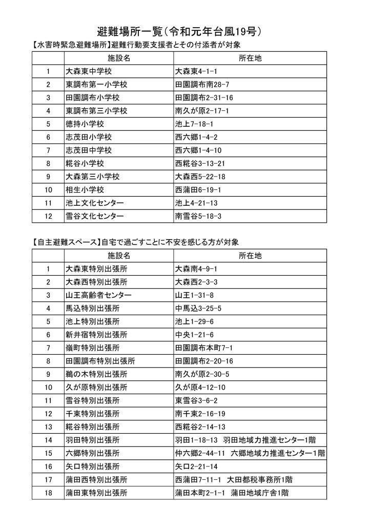 下は大田区の台風19号接近に伴う、緊急避難所、自主避難スペースの情報です。