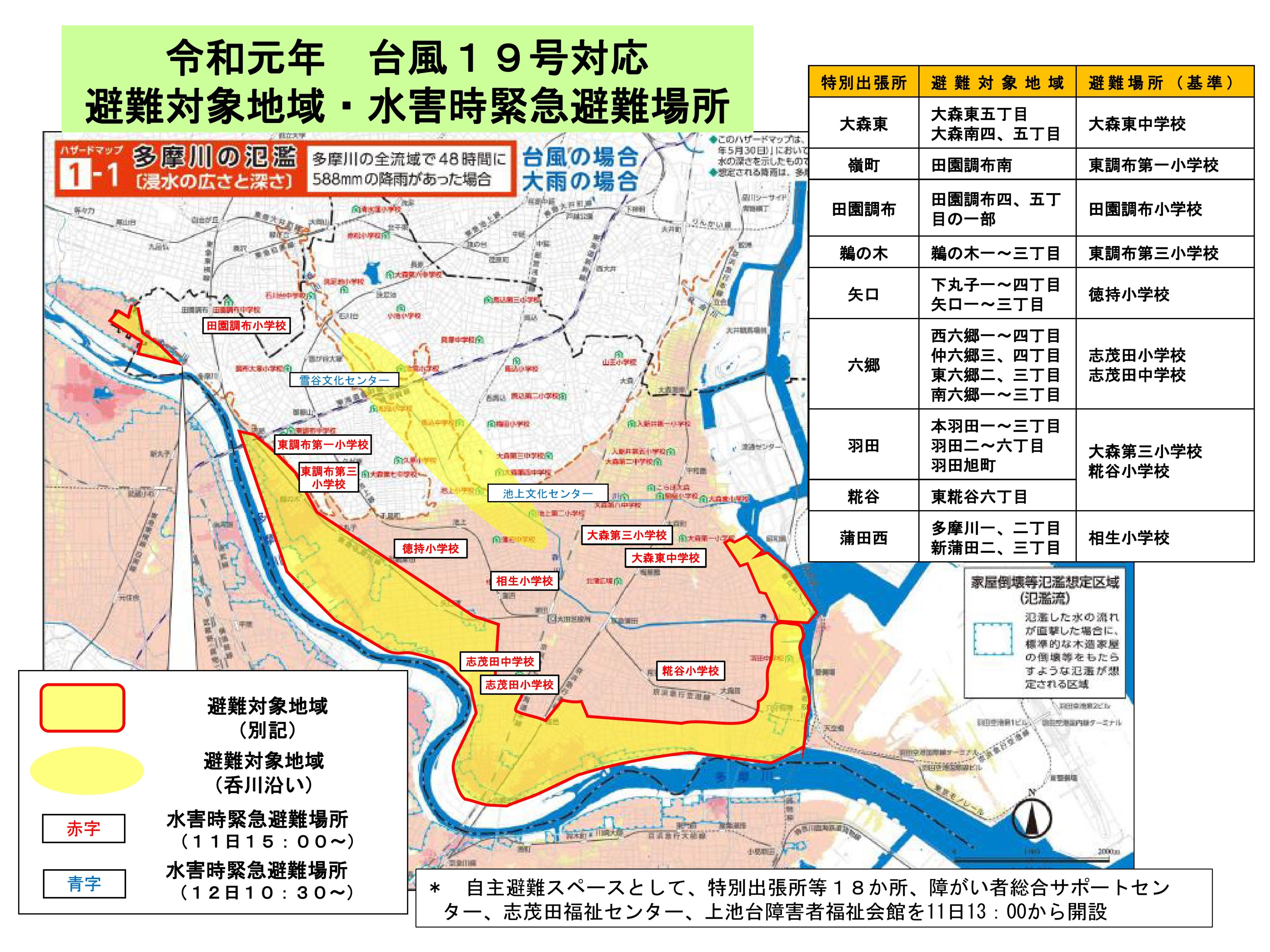 下は大田区の台風19号接近に伴う、緊急避難所、自主避難スペースの情報です。