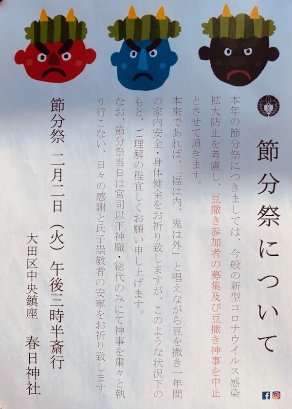【大森・春日神社】今年の節分は式典のみです。令和3年 hagiwaratakeshi2021年1月30日2022年3月21日豆まき、大田区、大森、春日神社 投稿ナビゲーション 前次へ 今年の春日神社の節分は、式典のみです。 令和3年2月2日午後3時30分から 共有:Tweetいいね 読み込み中…