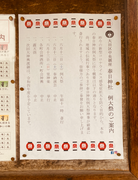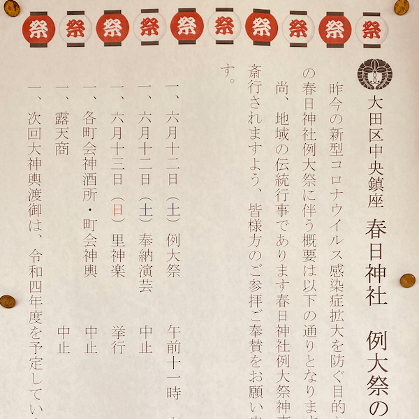 【大森・春日神社】今年の大祭は、式典のみです。令和3年 hagiwaratakeshi2021年5月29日2022年3月21日イベント、大田区、大森、新井宿、春日神社 投稿ナビゲーション 前次へ 今年の春日神社の例大祭は規模を縮小して行います。 共有:Tweetいいね 読み込み中…