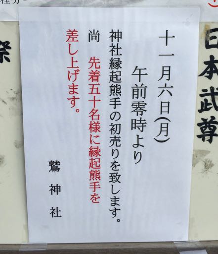 熊手の初売りが始まります。先着五十名には縁起熊手が!!私も毎年、ここで熊手を買っています。